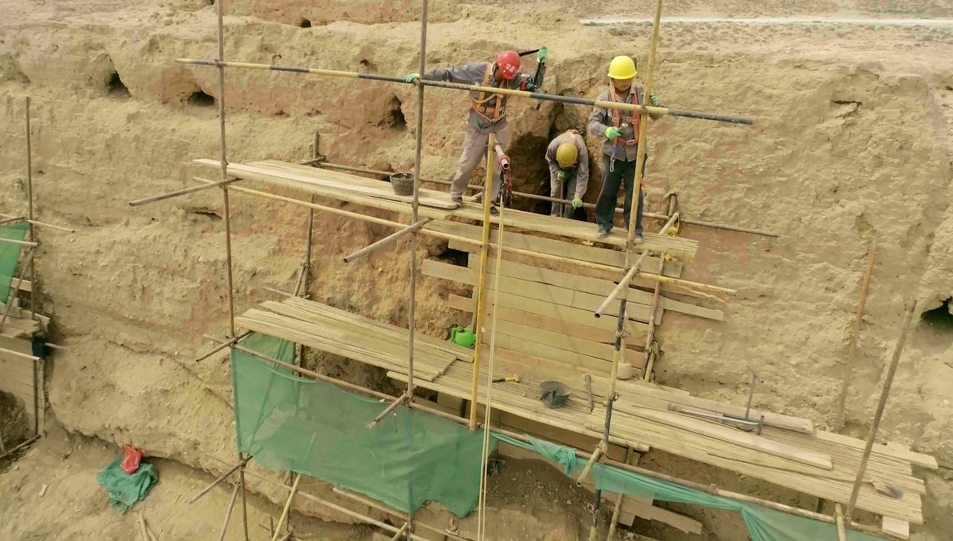 一槌又一槌,李军伟将身躯蜷缩在不到一米高的土洞内,夯实着洞内的填土,修复墙体上的孔洞,为模拟古代长城修筑工艺,维修工程不适用大型机械,没有宽敞的施工条件,工人们要经常钻到洞内,跪着干、趴着干。空旷的北岔口荒滩上,听着槌音回响,李军伟感觉自己正跨越时空,与古代筑城的将士们对话,对他而言长城是前辈匠人的心血,更是顽强不屈的民族精神的根脉。