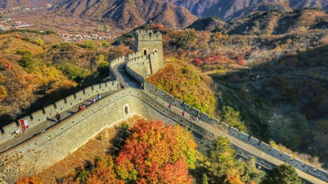 十月的黄崖关长城的色彩由昂扬的绿转成了明艳的红,高处望去,层林尽染,气势恢宏。